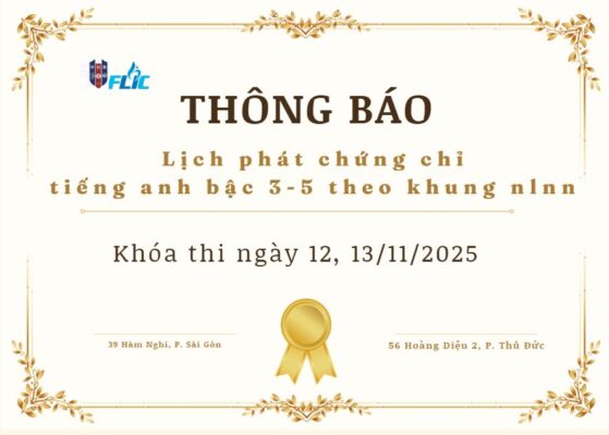 Thông Báo, Thông báo VSTEP 108 – Thông báo lịch phát chứng chỉ tiếng Anh bậc 3-5 theo Khung NLNN 6 bậc dùng cho Việt Nam – Khóa thi ngày 13, 14, 15/20/24 Thông tin liên hệ: 39 Hàm Nghi, Quận 1, Tp.HCM (028) 38.214.055 info@flic.edu.vn 0909.901.277 Website: www.flic.edu.vn / www.buh.edu.vn 56 Hoàng Diệu 2, Quận Thủ Đức, Tp.HCM (028) 38.971.649 028.66.813.713 0909.901.277
