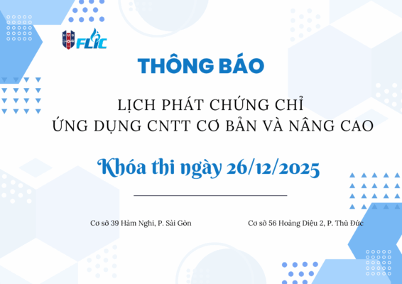 Thông Báo, Thông báo CNTT Cơ Bản, Thông báo CNTT Nâng Cao 137 – Thông báo tổ chức thi và cấp chứng chỉ tin học ứng dụng công nghệ thông tin cơ bản và nâng cao – Dự kiến thi ngày 22/01/2026 Thông tin liên hệ: 39 Hàm Nghi, Quận 1, Tp.HCM (028) 38.214.055 info@flic.edu.vn 0909.901.277 Website: www.flic.edu.vn / www.buh.edu.vn 56 Hoàng Diệu 2, Quận Thủ Đức, Tp.HCM (028) 38.971.649 028.66.813.713 0909.901.277