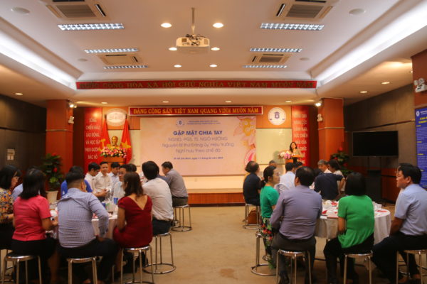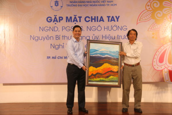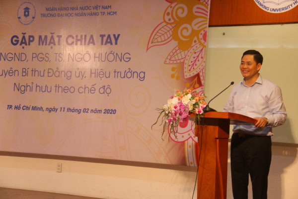 Phát biểu tại buổi tiệc chia tay, thay mặt Đảng ủy, Ban Giám hiệu Nhà trường, TS. Bùi Hữu Toàn đã khái quát về các mặt hoạt động của Trường Đại học Ngân hàng TP.HCM trong những năm vừa qua. Thầy Hiệu trưởng nhấn mạnh, để nhà trường có được sự phát triển mạnh mẽ như ngày hôm nay là nhờ những đóng góp to lớn của các thế hệ đi trước. Để tri ân, ghi nhận quá trình công tác, cống hiến của thầy Ngô Hướng đối với trường Đại học Ngân hàng TP. HCM, thay mặt Đảng ủy, Ban Giám hiệu nhà trường, thầy Hiệu trưởng kính chúc thầy Ngô Hướng cùng gia đình thật nhiều sức khoẻ để tiếp tục thực hiện những đam mê, sở thích mà trước đây chưa thực hiện được. TS. Bùi Hữu Toàn cũng bày tỏ mong muốn thầy Ngô Hướng sẽ tiếp tục quan tâm và có những ý kiến đóng góp cho Đảng ủy, Ban Giám hiệu và các cán bộ, giảng viên của nhà trường, để ngày càng thực hiện tốt hơn nhiệm vụ chuyên môn cũng như nhiệm vụ chính trị mà Đảng, Nhà nước và Ngân hàng Nhà nước đã tin tưởng giao phó.